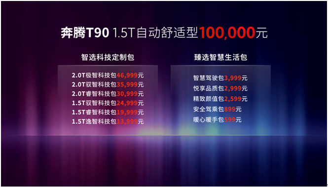 奔騰T90采用了全新的定價(jià)模式,打破了車企傳統(tǒng)的款型定價(jià)模式。除了有起售價(jià)之外,用戶還可以選擇不同的配置升級(jí)包,根據(jù)自己的個(gè)人需求和預(yù)算進(jìn)行選擇和增配,實(shí)現(xiàn)個(gè)性化定制。此舉使得消費(fèi)者可以根據(jù)自己的實(shí)際需求定制奔騰T90,為他們提供更具性價(jià)比的選擇。